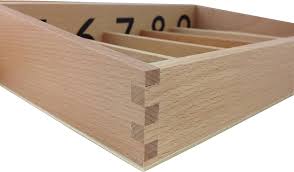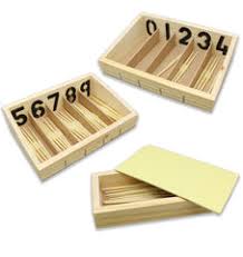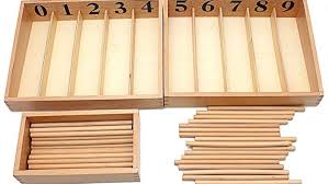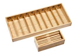 Two wooden boxes made of beechwood, with compartments labelled 0-9 and 45 loose wooden spindles.